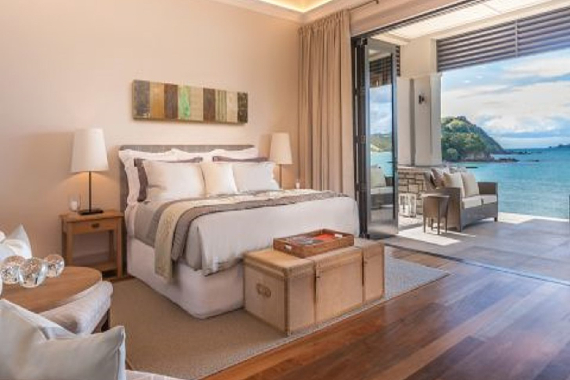Helena Bay Lodge hospeda no máximo cinco casais acomodados em cinco suites de luxo com nomes de pássaros nativos da Nova Zelândia. Decoradas com obras de arte ecléticas e tesouros, que os proprietários colecionaram durante suas viagens ao redor do mundo. Estas peças cativantes e fascinantes complementam o opulento design interior. Todas as suítes possuem amplas varandas com vista para as praias de Helena Bay, Binóculos Leica são fornecidos para poder observar a vida das aves, baleias e golfinhos visitantes e embarcações rastreando a baía em direção ao mar.