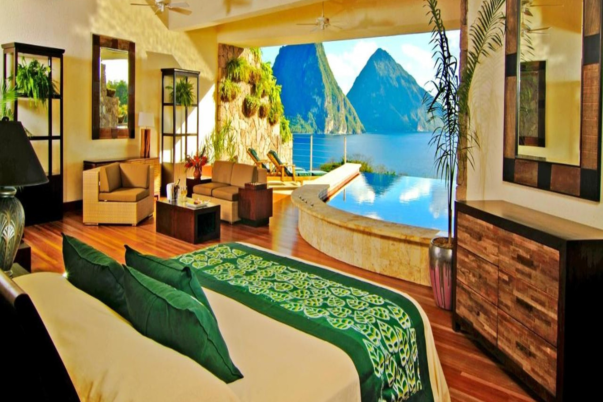 As 29 suites de luxo são chamadas de santuários, espaços amplos onde o quarto, a área de estar e uma extravagante piscina privativa de borda infinita se misturam para formar plataformas extraordinárias flutuando na natureza. Com a quarta parede totalmente ausente, os santuários de Jade Mountain são cenários semelhantes a palcos para abraçar toda a glória do Património Mundial Pitons de Santa Lúcia e do Mar do Caribe. Jade Mountain estabeleceu um novo padrão no Caribe, seja em termos de design moderno, vida luxuosa ou experiências exclusivas de resort e atendimento ao hóspede.