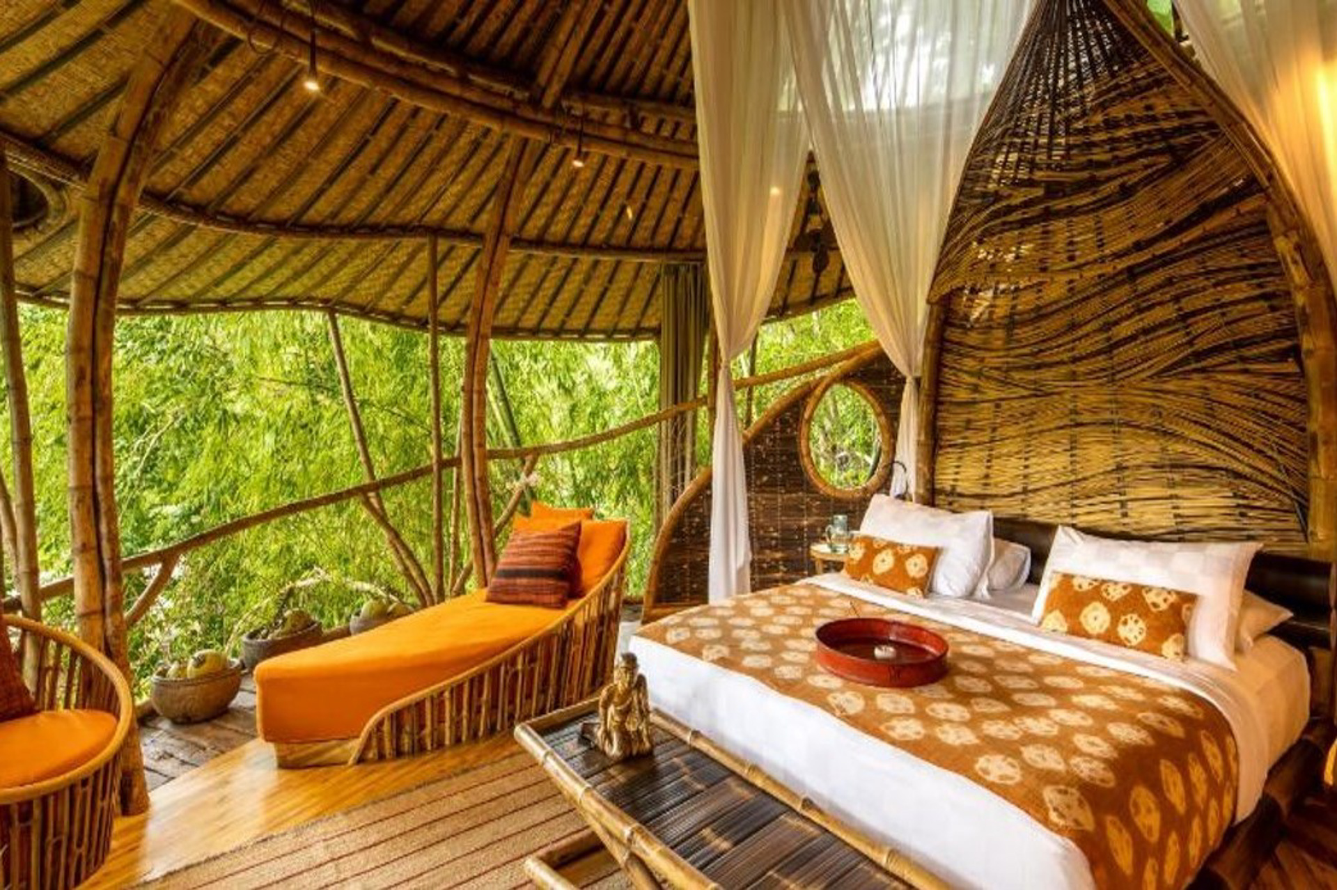 Pequeno e íntimo com seis casas de bambu deslumbrantes e únicas, com vista para piscinas naturais alimentadas por nascentes no rio e mais quatro num penhasco exuberante. Decoradas com artefactos e artesanato coletados pelo Sudeste Asiático e inspirados pela paixão por viver em harmonia com o meio ambiente, oferece nove estruturas únicas de bambu orgânico e uma casa nupcial javanesa de tirar o fôlego. Se deseja dormir no alto das árvores, na beira do rio ou aninhado num penhasco na selva, levará certamente memórias preciosas.