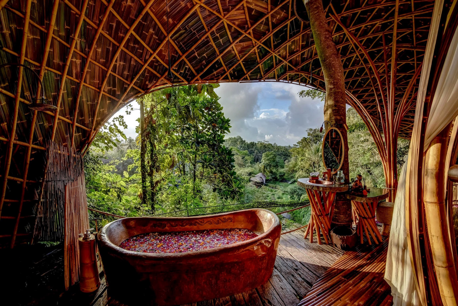 Bambu Indah, é um retiro na selva ecologicamente consciente. Hotel boutique em Ubud que se orgulha de combinar o melhor da arquitetura e design antigos, arquitetura inovadora de bambu com práticas modernas e sustentáveis num ambiente de luxo.