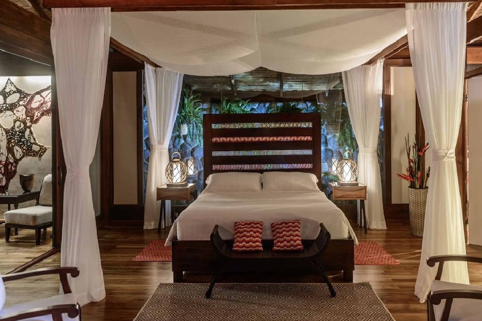 Espalhadas ao longo das margens do rio e subindo a encosta, as vinte luxuosas e bem equipadas suites de arquitetura indígena inspirada no Cabécar. A floresta tropical intocada, a cozinha requintada da fazenda à mesa, a hospitalidade genuína são um cartaz de visita para uma experiência única, autêntica e memorável.